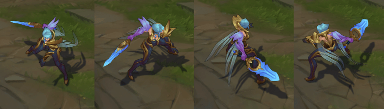 The particles are vivid in color with little sparks flying around, and the blue swirl of Broken Wings is soft and eye-catching, with slashes that flow with ease and end in a powerful yet ethereal explosion of magic. Ki Burst explodes like a flower with flowing sparks after a quick hemisphere, and Valor makes her leave a soft trail of blue shadows that ends in a glowing globe of protection with ornamental shields around, similar to her sword’s ring-guard. Blade of Exile explodes in a burst of gold, which also accompanies any ability used while it is active. Wind Slash is an elegant projection of a golden ring flanked by blue wings and leaving a translucent trail of blue and gold behind, which is very charming but hardly lethal.