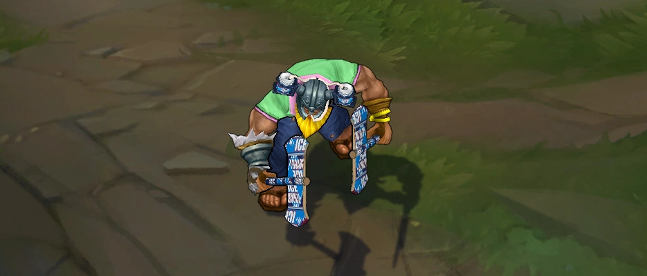 Brolaf’s design is a hilarious departure from Olaf’s usual ready-for-battle look. In this skin, Olaf ditches his typical armor and rocks a laid-back t-shirt, jeans, and flip-flops. But don’t let the casual outfit fool you; Brolaf still knows how to pack a punch. His axes, even though they’re cardboard, hit just as hard as his regular metal ones.