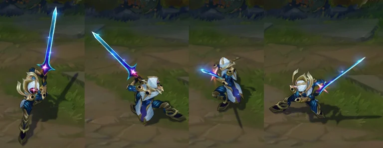 His outfit, oh boy! It’s like he raided the galaxy’s wardrobe department, donning regal white, blue, and gold armor that screams celestial elegance. What about particles? When Yi kicks into high gear with his ultimate ability, a mesmerizing trail of white and blue light follows him, resembling a magnificent cosmic comet. And Riot Games didn’t stop there. His Alpha Strike has been tweaked to look like a shooting star, making his every move a spectacle worth witnessing.