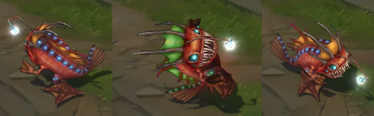 The skin features a nightmarish anglerfish design with sinister teeth and an eerie angler. While it alters Kog’Maw’s appearance, it doesn’t introduce new particles, animations, or sound effects, but it transforms his demeanor and presence.