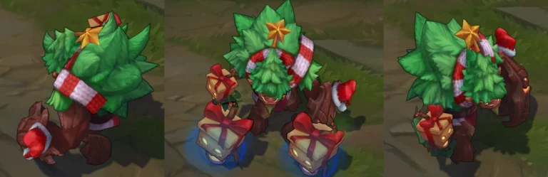 • Maokai’s visual upgrade shows off the holiday theme, with a red and white scarf, boxed saplings, and a golden star on his head.