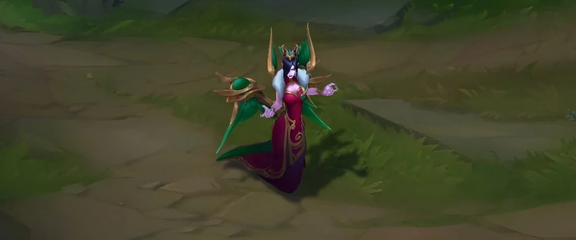 This skin features a visually captivating design with an elegant red dress, mesmerizing green wings, and a regal green crown. The color scheme transitions from lush green to striking red, and the intricate wing design makes Morgana appear like a lunar enchantress.