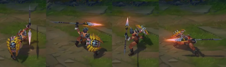 When it comes to the design of Ruthless Pantheon, Riot Games has gone all out. He sports a gnarly helmet with menacing spikes, sturdy boots, and wields a glowing spear and a yellow makeshift shield pieced together from various parts. It’s like he’s straight out of a Mad Max movie! This update takes him from a more fantasy-like aesthetic to a sci-fi post-apocalyptic one. Splash art? Cool as ever, with explosions and chaos all around him. Unfortunately, this skin has no new particles, aniamtions or sounds.