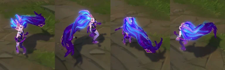 The skin features intricate model and texture changes, with a sinister touch to Zoe’s appearance. It introduces new visuals and sounds, enhancing abilities like Sleepy Trouble Bubble (E) and Recall (B). The skin’s purple, pink, and dark blue hues with celestial elements make it visually captivating.
