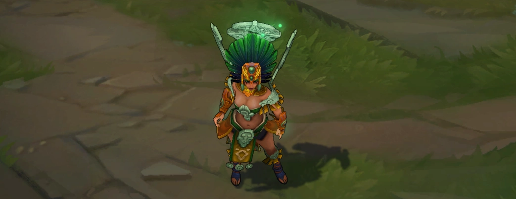 The skin’s design showcases elaborate visuals, including detailed attire, an Aztec pyramid in the splash art, and a striking blend of green and fiery orange hues, creating a unique and captivating aesthetic.