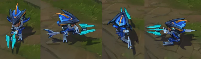 The skin features a new model and texture with shiny blue armor for both Fizz and Chomper. It includes a particle overhaul, adding vibrant new effects to Fizz’s abilities and attacks. The skin also boasts an epic recall animation where Fizz jumps into his mech, reminiscent of Power Rangers.
